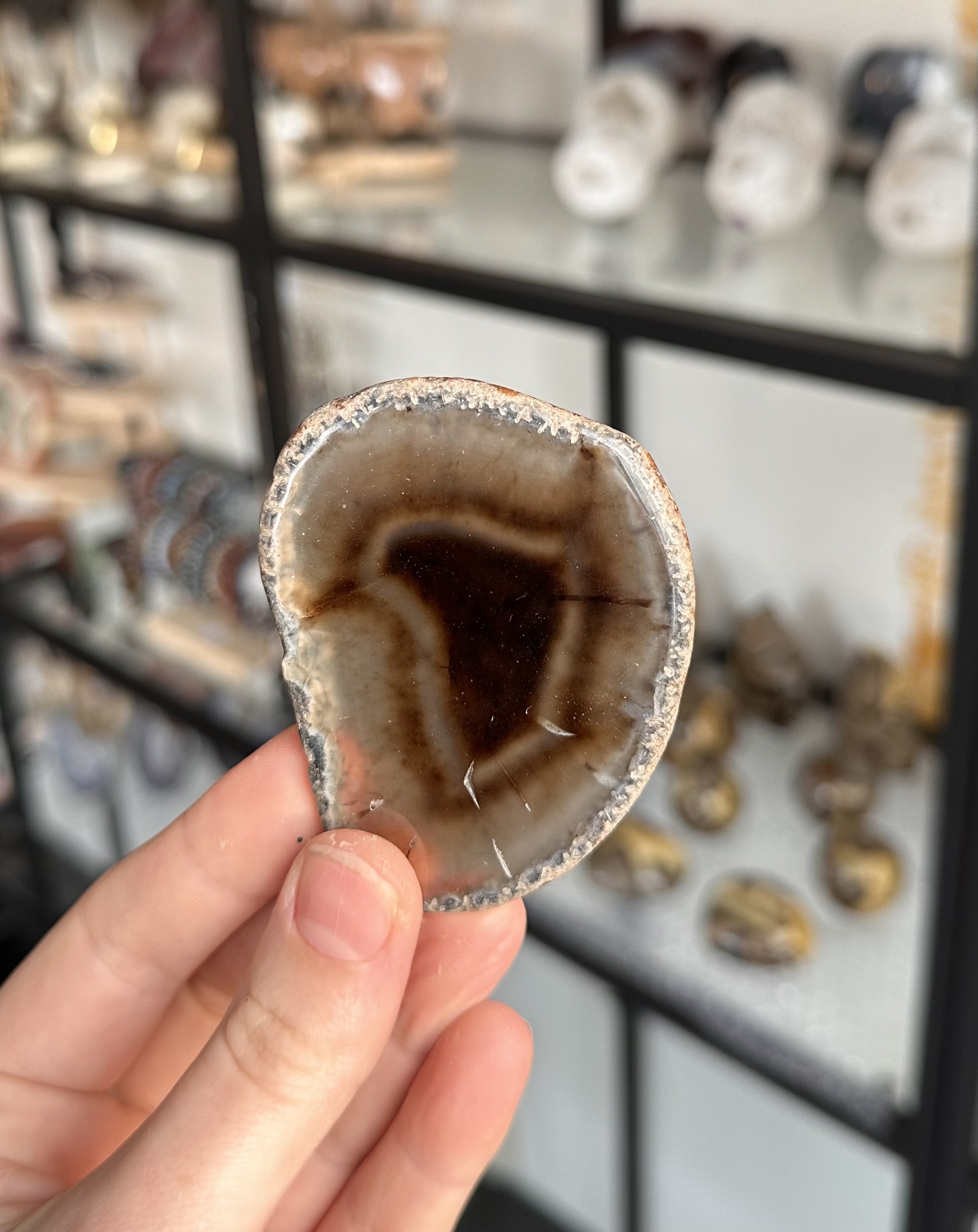 Een elegant agaat schijfje met natuurlijke patronen. Meerdere soorten op voorraad. Let op: Afbeelding is een voorbeeld. Uiteindelijke product kan in dit geval afwijken van de afbeelding. Agaat staat bekend om zijn aardende en beschermende werking, brengt balans en rust en versterkt innerlijke kracht. Ideaal om bij je te dragen, neer te leggen in je ruimte of toe te voegen aan je kristallen collectie.