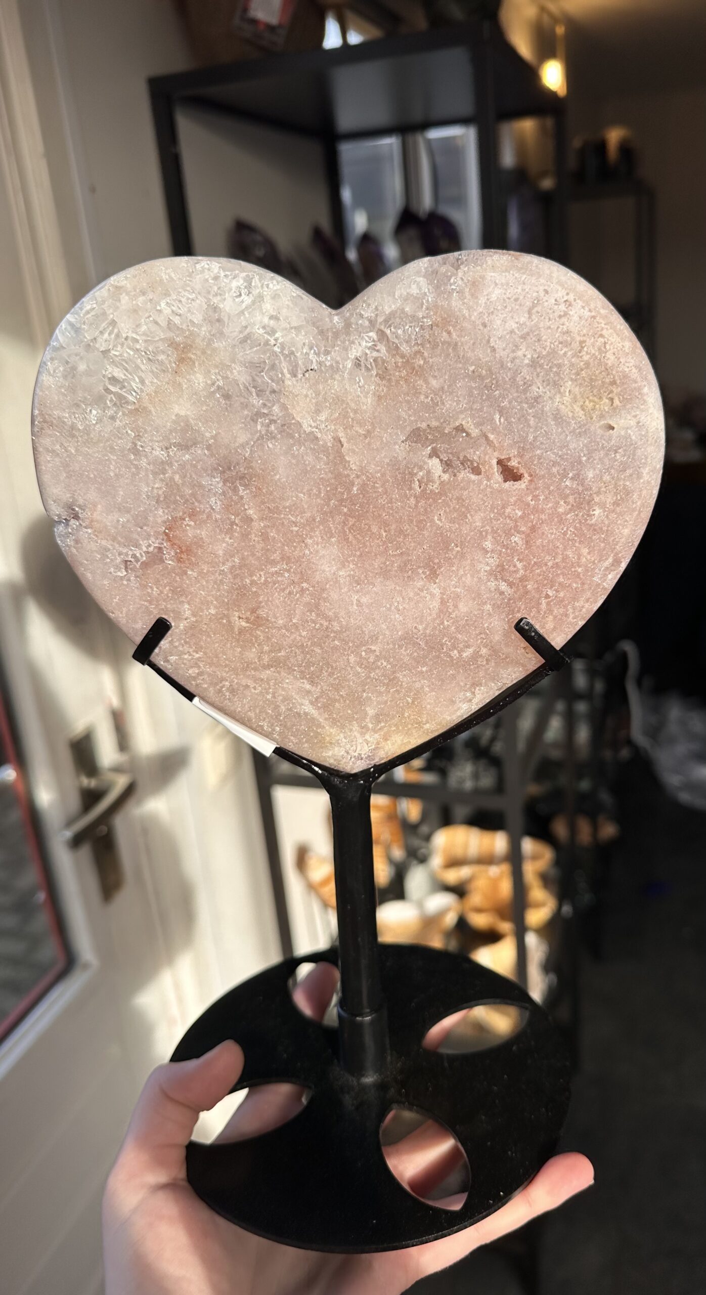 Deze roze amethist in hartvorm op een zwarte metalen standaard is een opvallend en sfeervol decoratiestuk. De zachte roze tinten lopen mooi over in de natuurlijke kristalstructuur, wat zorgt voor een warme en rustgevende uitstraling. Met een gewicht van 1325 gram voelt dit stuk stevig en luxe aan. Door de hartvorm en de elegante presentatie is het een echte eyecatcher, perfect voor in huis, een winkel of een praktijkruimte. Een uniek natuurproduct dat zowel decoratief als bijzonder is.