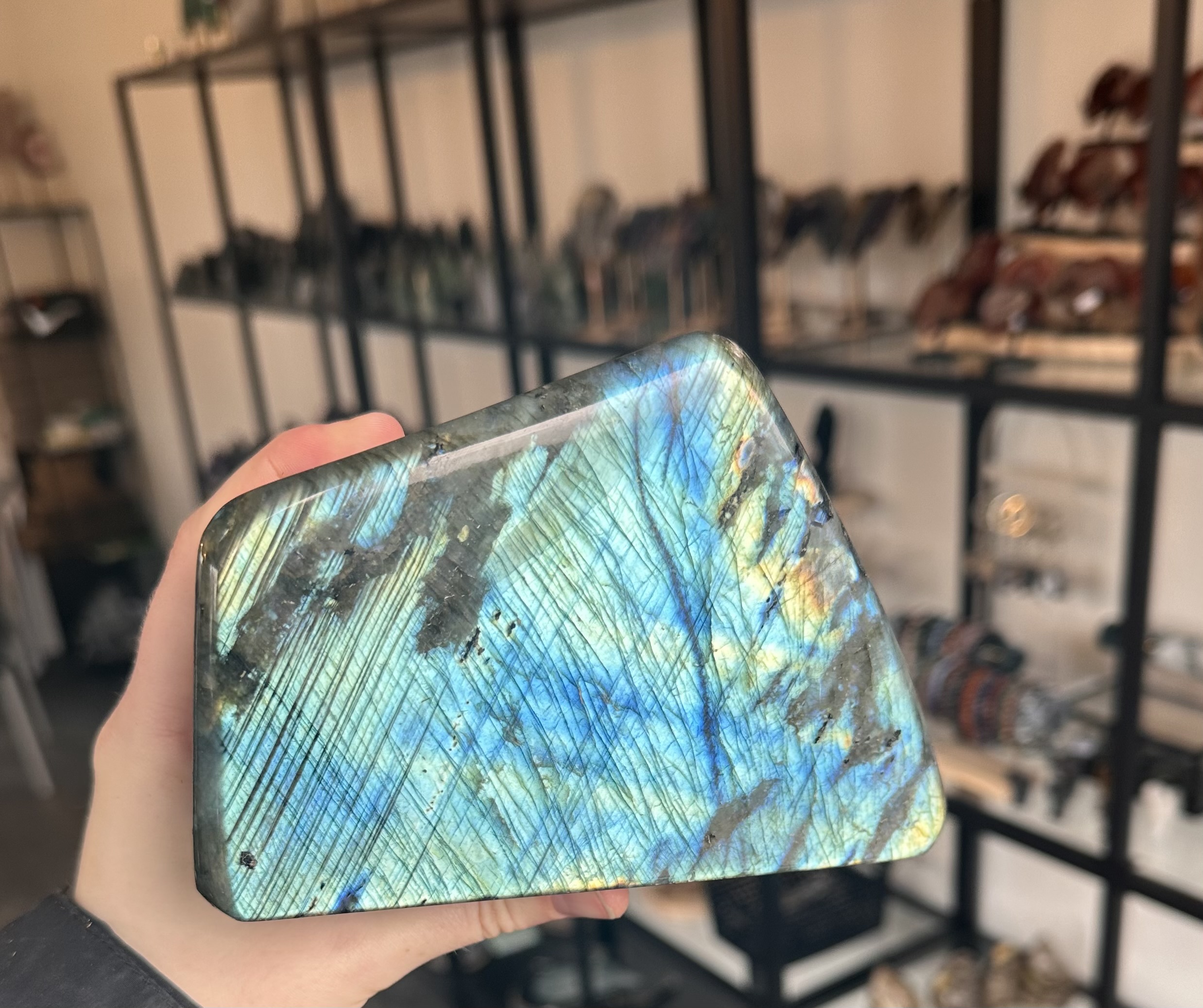 Prachtige labradoriet van 1450 gram met krachtige kleurflitsen en een diepe glans. Labradoriet staat bekend als een beschermende en intuïtieversterkende steen. Hij helpt om prikkels te filteren, energie te beschermen en creatief inzicht te stimuleren. Een ideaal stuk voor wie rust, balans en spirituele verdieping zoekt.