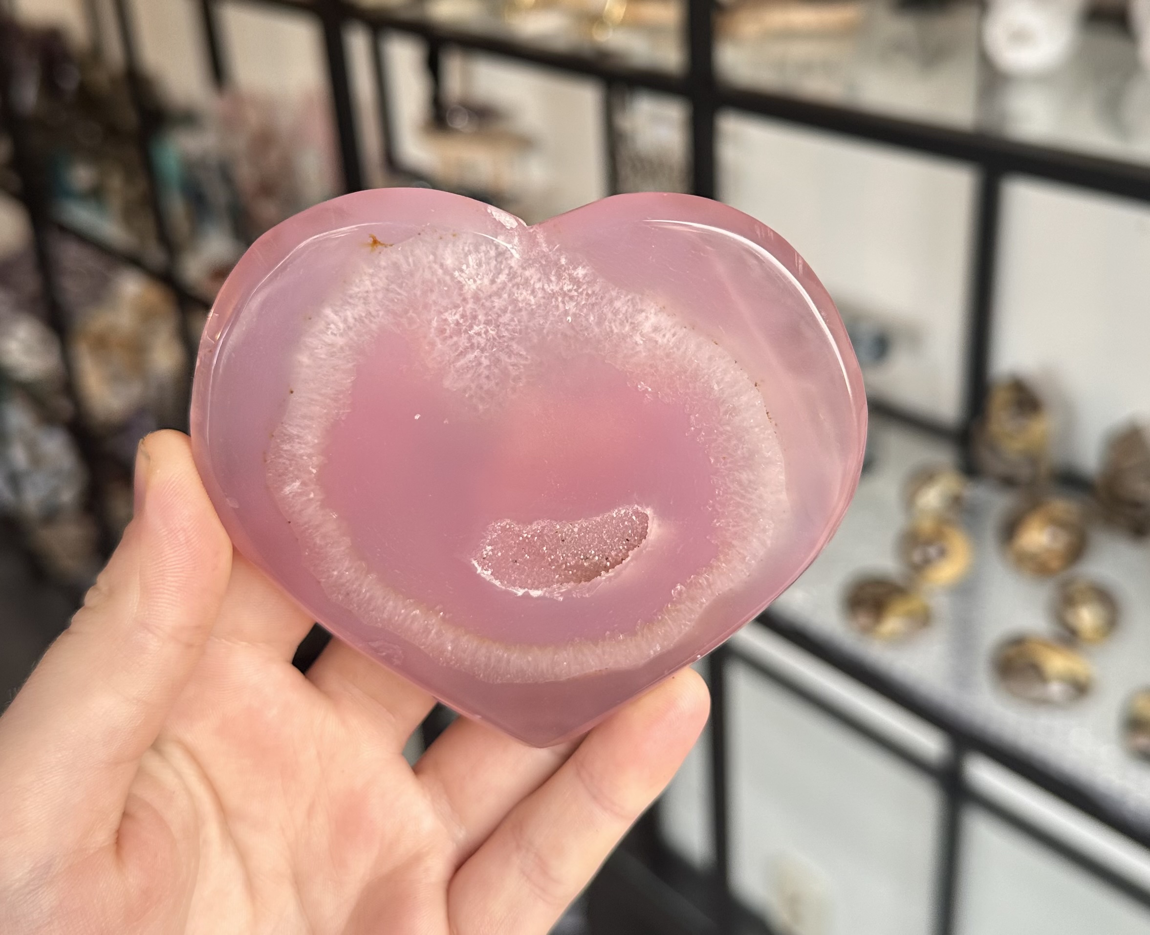 Dit roze agaat hartje van 180 gram heeft een prachtige druzy die subtiel schittert. De zachte roze tinten en natuurlijke kristalvorming geven het hartje een unieke en liefdevolle uitstraling. Mooi als decoratie of als bijzonder en betekenisvol cadeau.